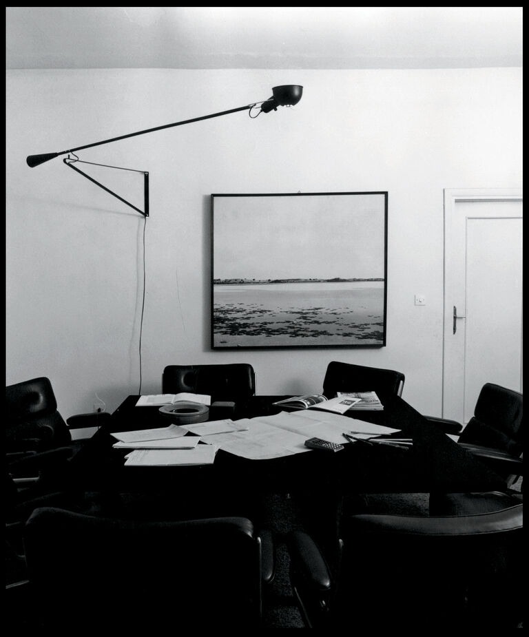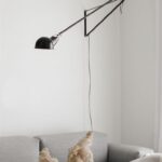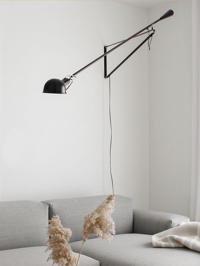 Aplique de luz directa. Reflector y brazo orientable en acero, pintura líquida. Soporte reflector en latón cromado. Contrapeso cónico en fundición. Base de conexión a pared en acero pintado.