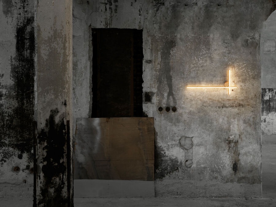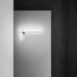 Sistema de iluminación con luz difusa para instalación mural compuestos por una varilla horizontal (modelo Wall 1) o por una varilla vertical y una horizontal (modelo W2). Cada varilla está compuesta por: un cuerpo de aluminio extruido trabajado y anodizado en coloración champán y un difusor de silicona óptica de platino estriado integrado (CRI 90). Cada modelo incluye su propio rosetón, cuya electrónica integrada utiliza únicamente el sistema de regulación TRIAC.