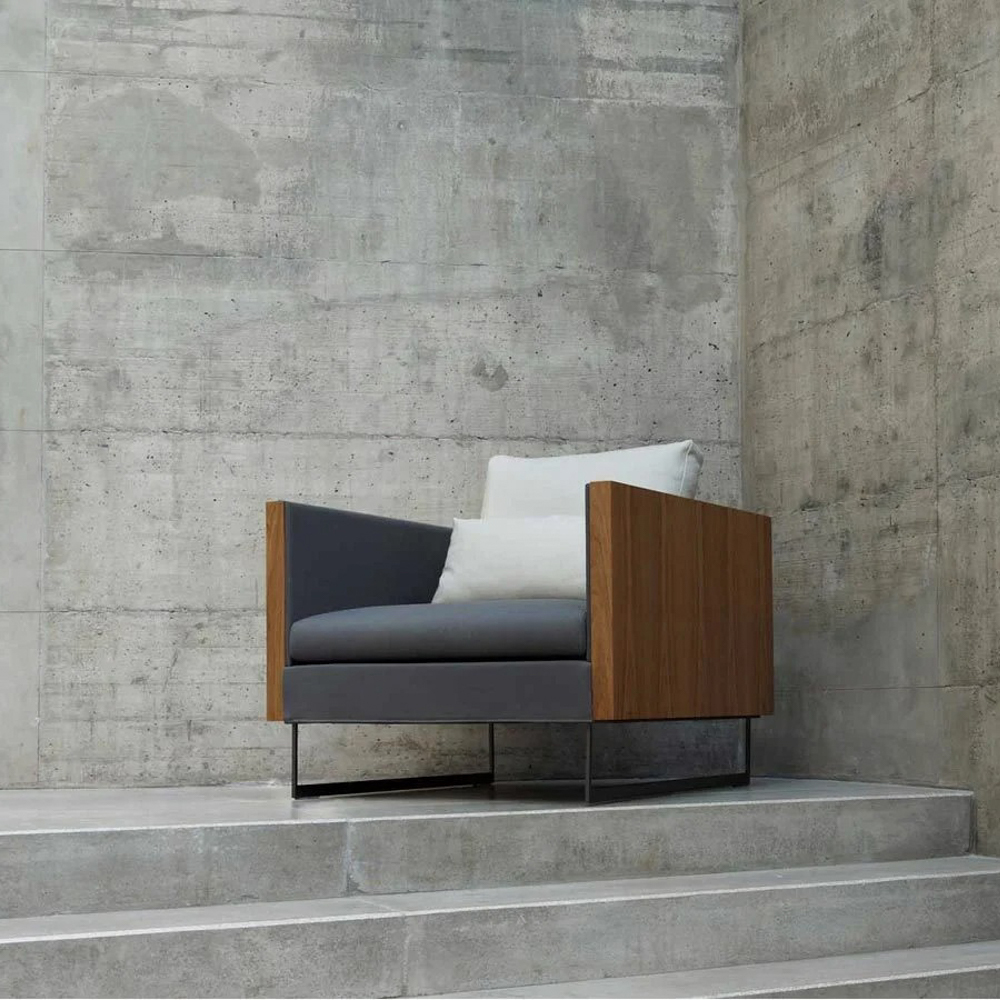 Un marco exterior de madera (roble o nogal) abraza un interior tapizado de líneas precisas. El contraste entre materiales aporta calidez y un punto arquitectónico muy actual. Perfecta para salones con carácter y proyectos de hotelería. Diseño de Mario Ruiz.