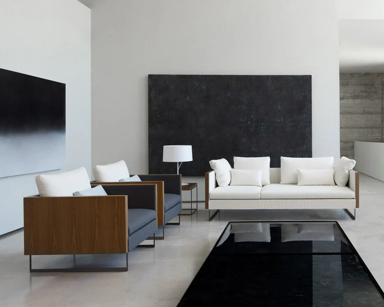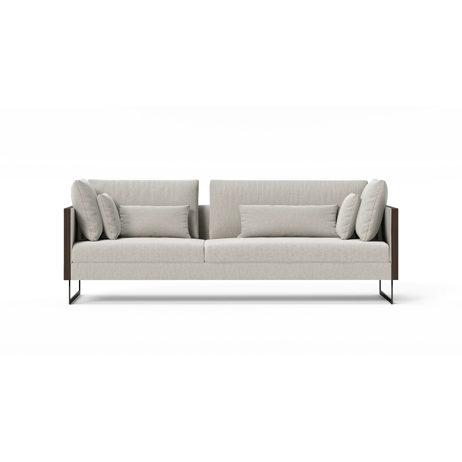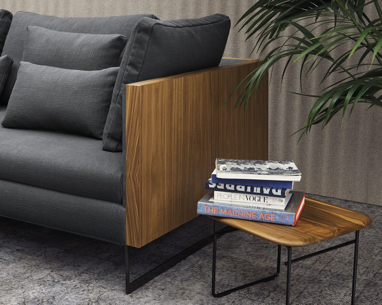 Calidez que abraza: un marco exterior de madera destaca por su precisión y contrasta con el interior tapizado. Se apoya en bases metálicas en U para una estética liviana y arquitectónica. Personalizable en acabados y medidas. Diseño de Mario Ruiz.