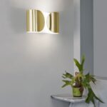 ámpara de pared de luz directa /indirecta/ difusa parcialmente. El soporte de a pared es de acero troquelado, plegado y barnizado en polvo, de color blanco brillante. Difusor de metal troquelado, curvado y barnizado en polvo. Los dos soportes portalámpara son de nylon (PA6), moldeado por inyección, de color blanco.
