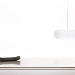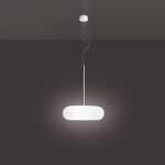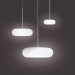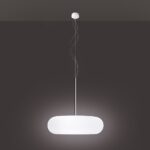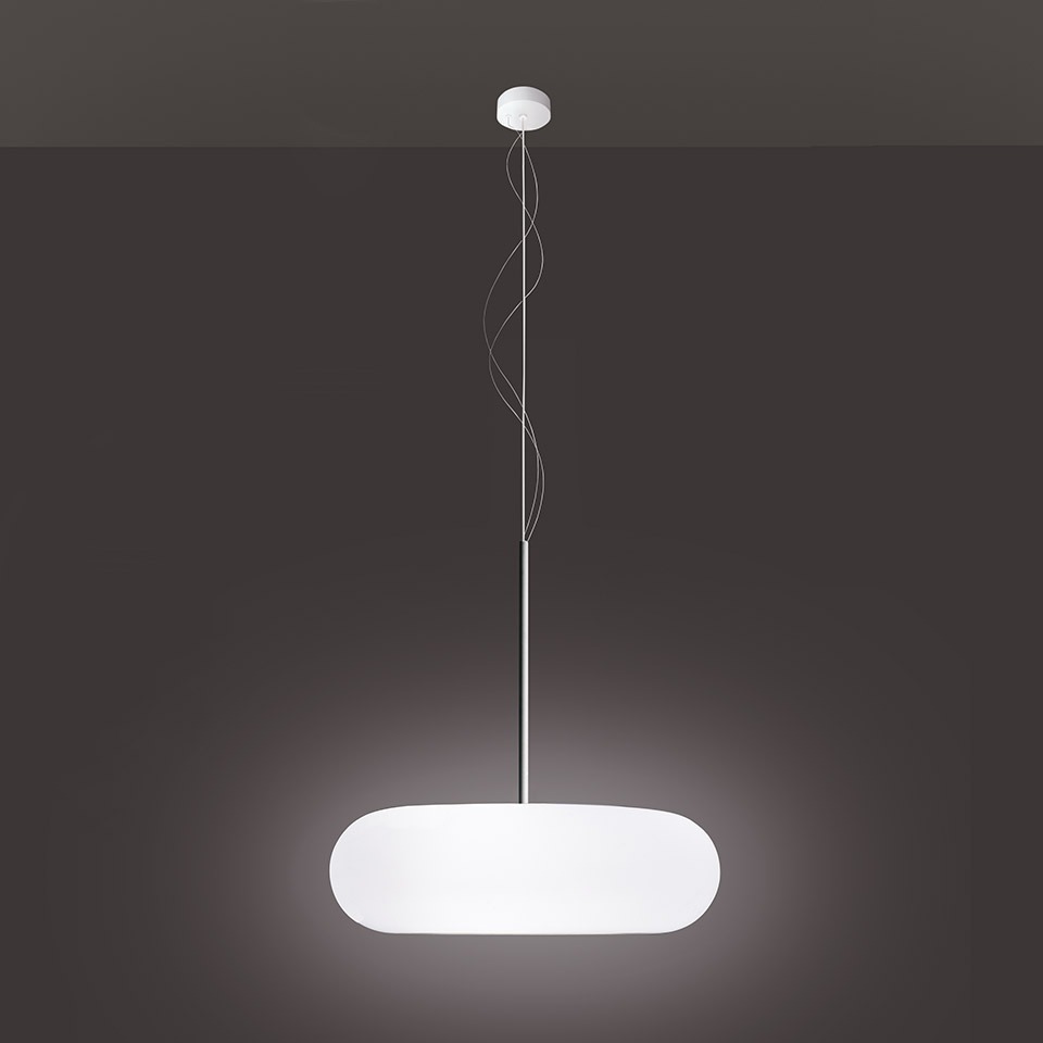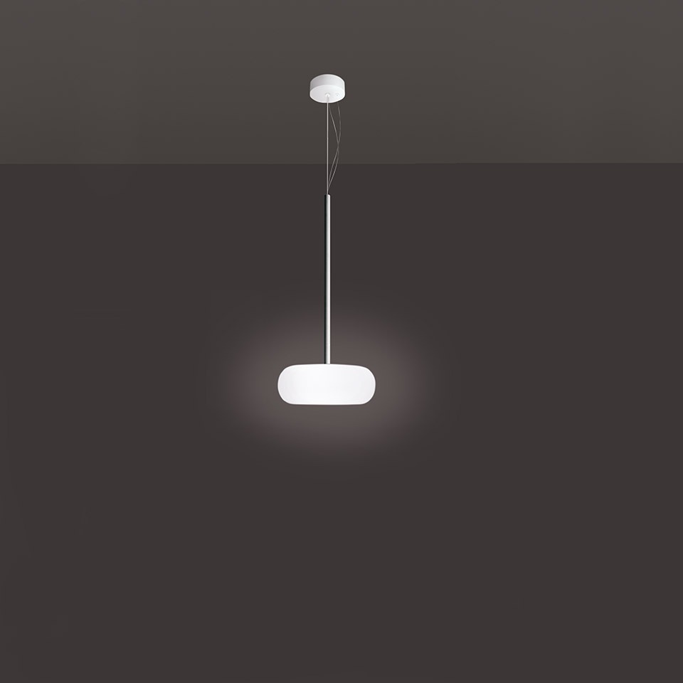Itka sospensione es una lámpara colgante de vidrio opalino esmerilado soplado a mano con estructura de metal pintado en blanco y recubierto de PVC. A pesar de la forma plana del difusor, la lámpara distribuye la luz uniformemente, sin dejar zonas de sombra en su superficie.