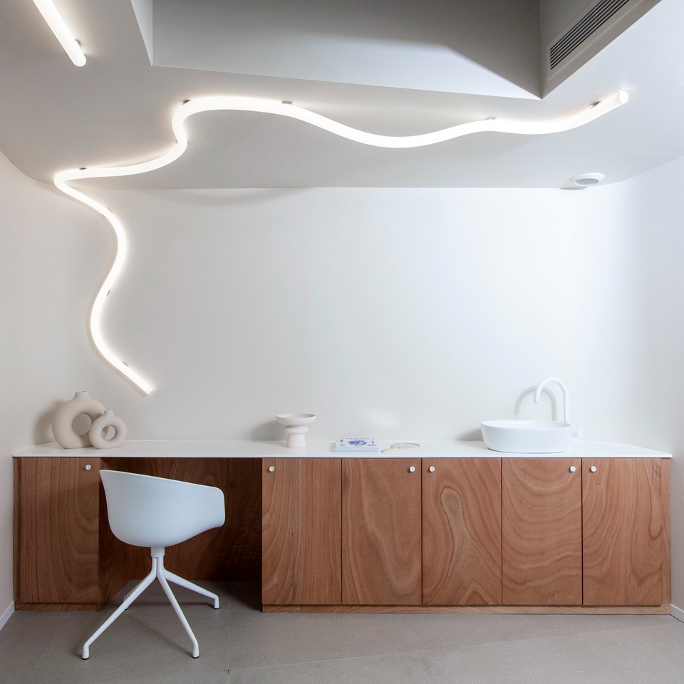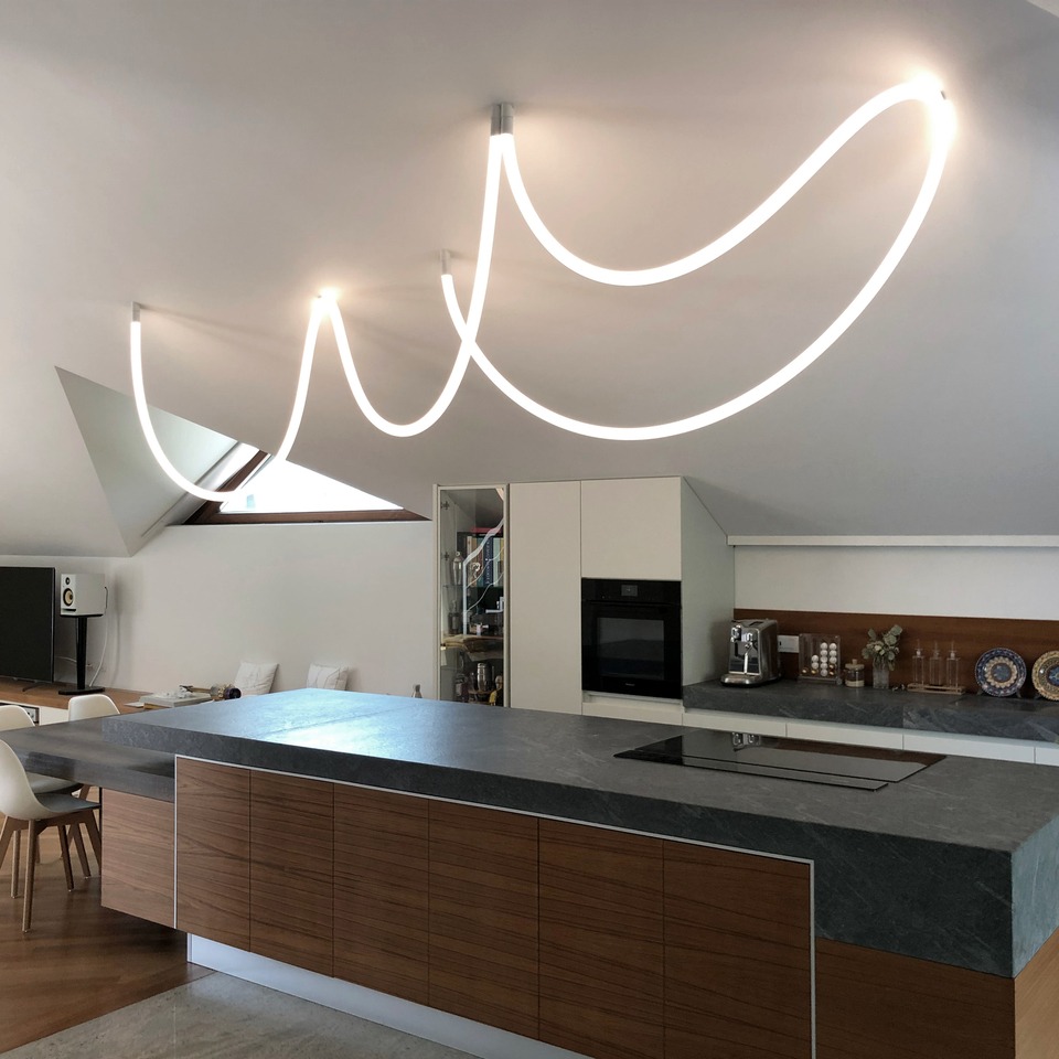 La Linea es un tubo de luz flexible capaz de girar libremente en el espacio, creando geometrías indefinidas. Se integra fácilmente en espacios interiores y exteriores gracias a elementos de fijación que desaparecen en la sección transversal, permitiendo innumerables aplicaciones en una amplia variedad de entornos. Su combinación única de calidad de luz, grado de protección IP y flexibilidad lo convierte en una solución de iluminación versátil. Disponible en longitudes de 2,5 y 5 metros.