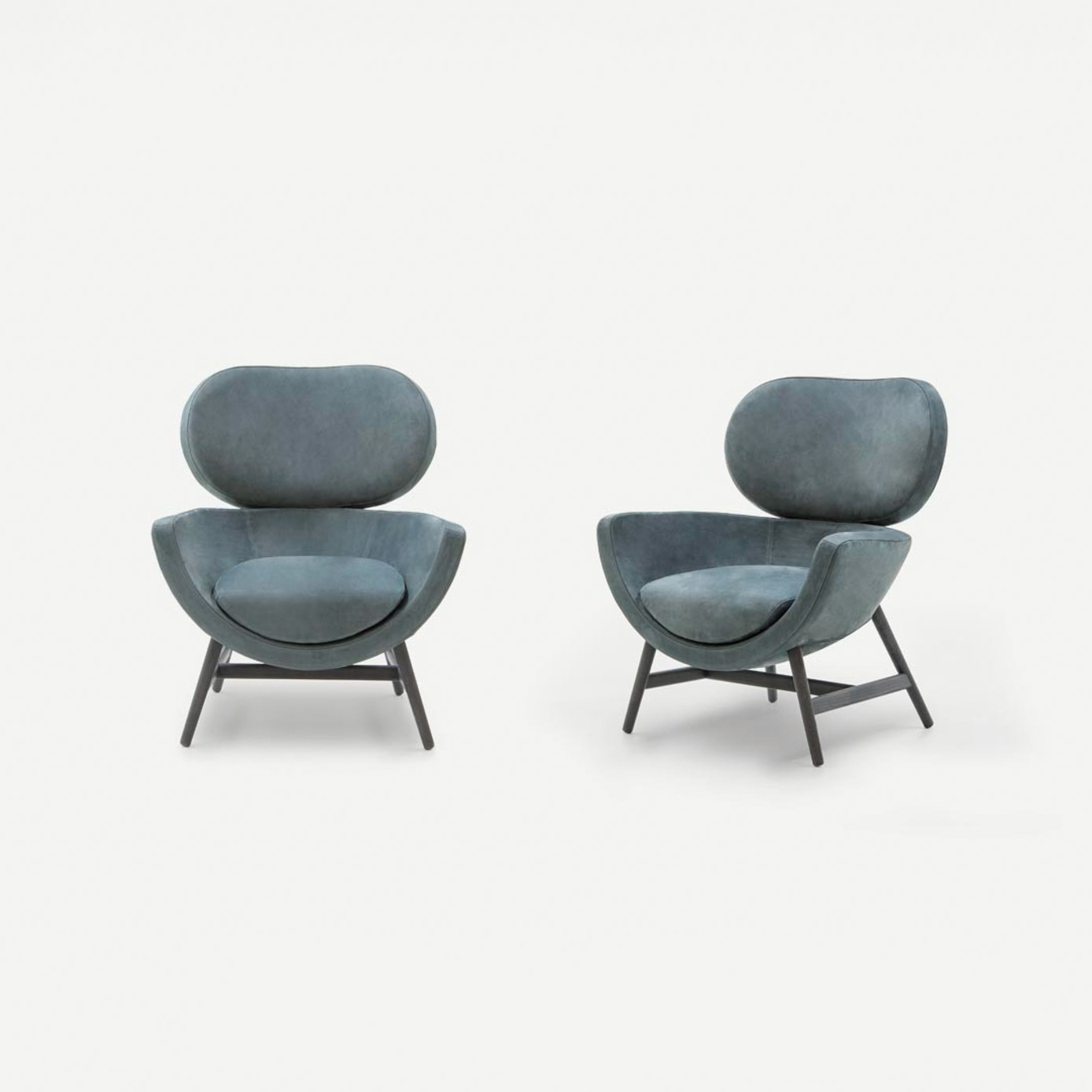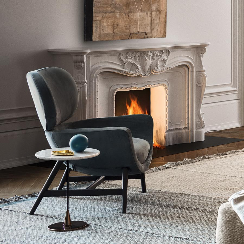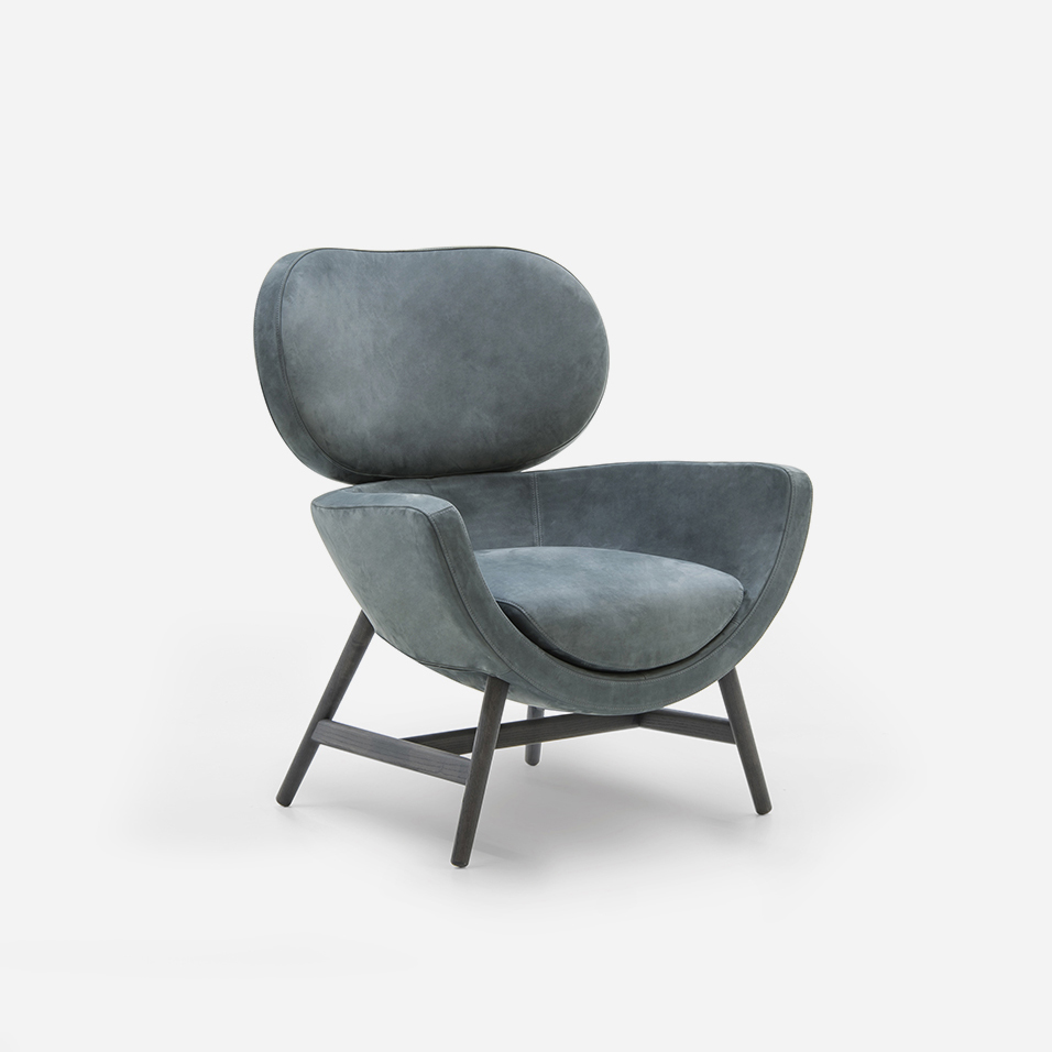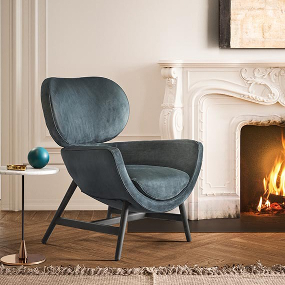 Compacta, elegante y con un respaldo curvo que recoge con naturalidad. Funciona sola como pieza acento o a pares, aportando calidez con su estructura de madera. Perfecta para salones y suites que buscan confort con gesto contemporáneo. Diseño de Calvi Brambilla.