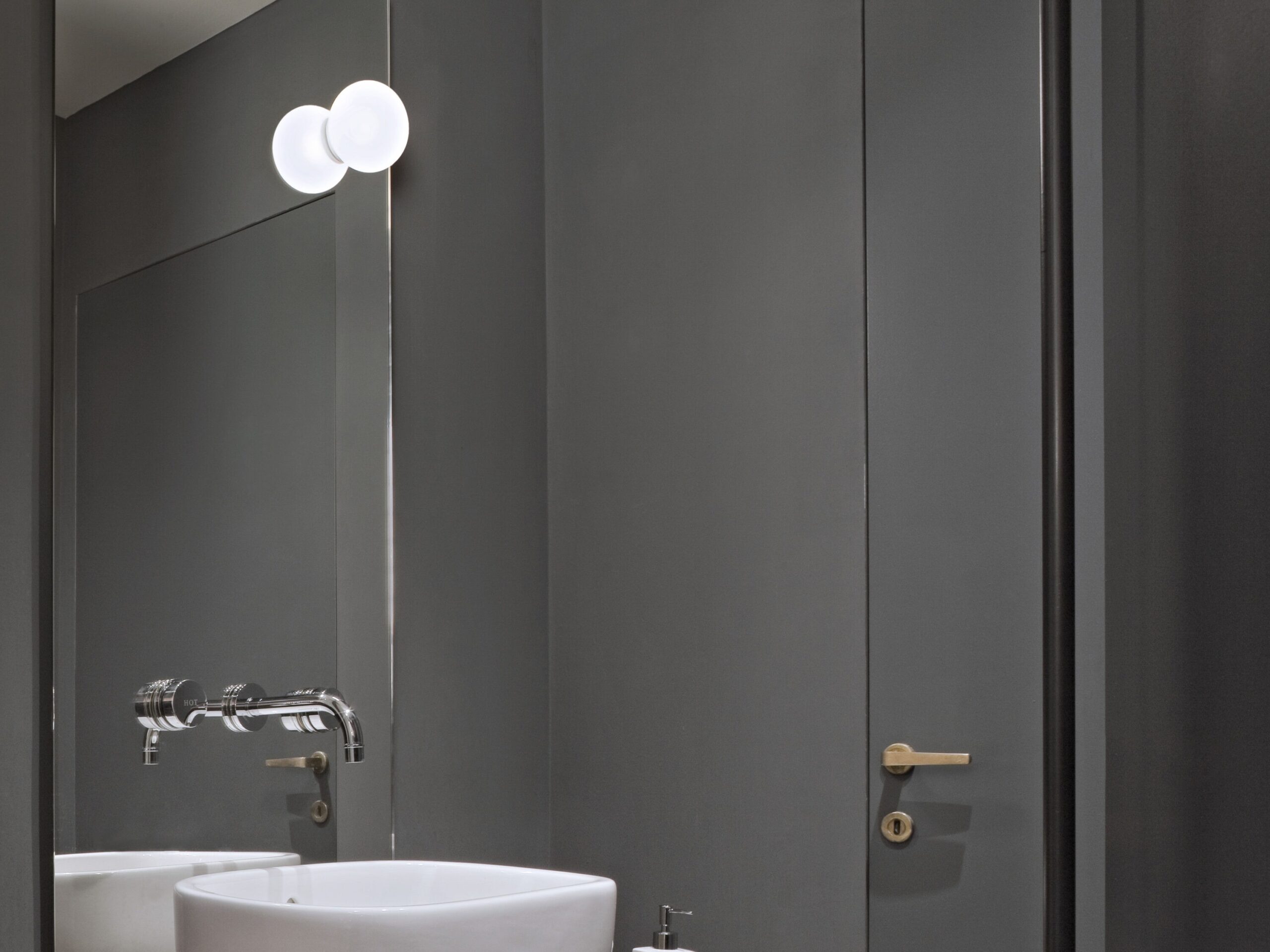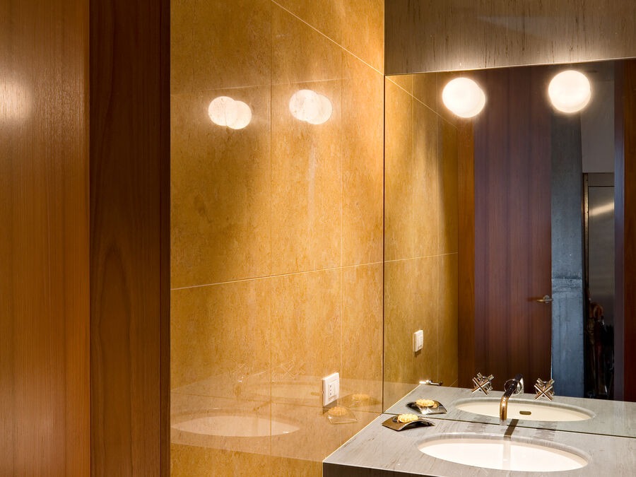 Aplique o plafón o lámpara para espejo de luz difusa. Difusor conformado por un cristal soplado opalino tratado al ácido y un aro con rosca en PPS de color blanco estampado por inyección. Aro para montaje en el espejo en PPS de color blanco estampado por inyección. Fijación espejo: ø 35 mm.