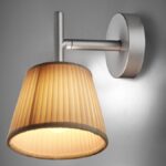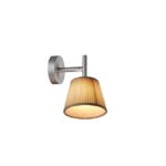 Aplique de luz difusa. Difusor interior en cristal borosilicato prensado tratado al ácido. Difusor exterior en tejido plisado. Soporte difusores y soporte lámpara en aleación de aluminio fundido a presión, pintado en color gris. Base de conexión a pared en policarbonato gris estampado por inyección. Florón en policarbonato estampado por inyección, pintado en color gris.