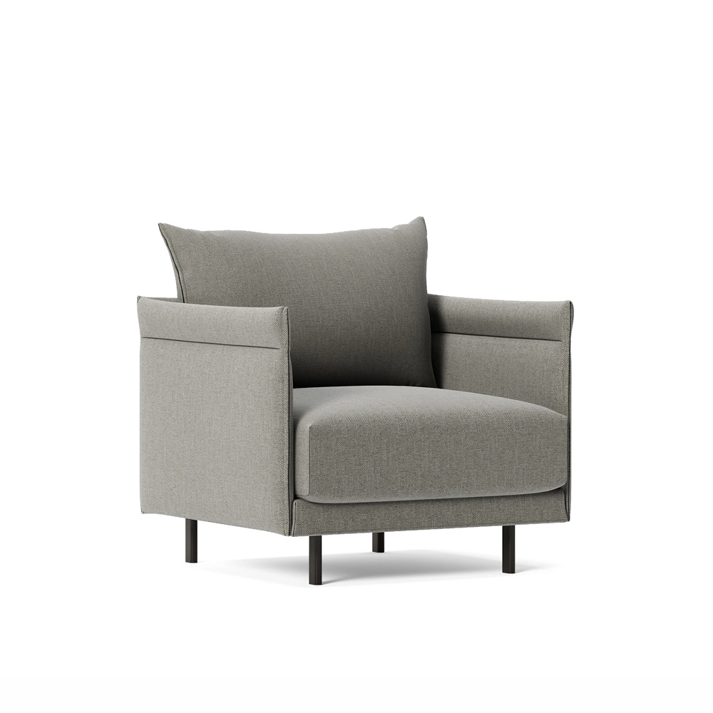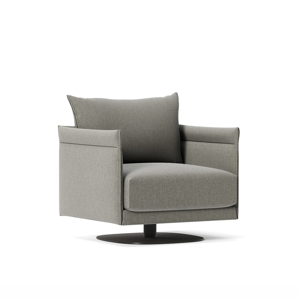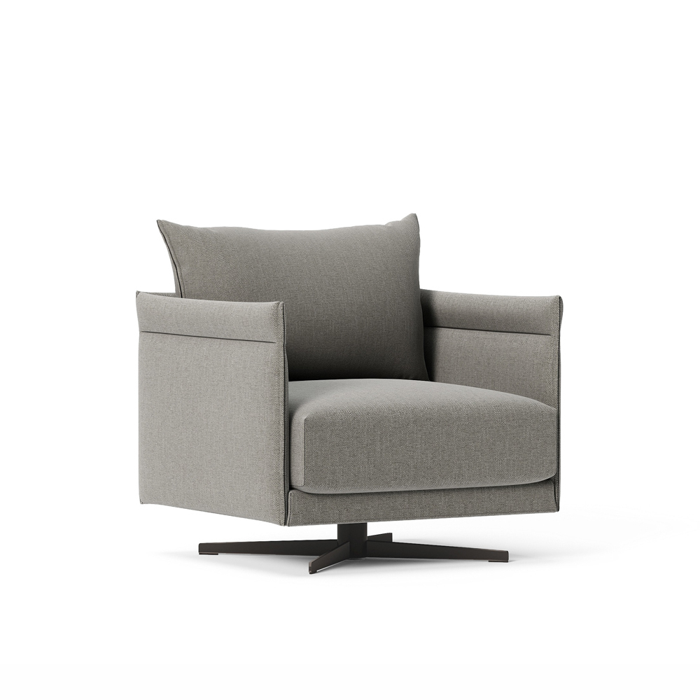 Estructura esbelta y cojines mullidos perfilados por costuras precisas, para un confort equilibrado. Puede montarse con patas finas o sobre base pedestal, adaptándose al estilo del proyecto. Es un comodín elegante para salones y suites. Diseño de Mario Ruiz.