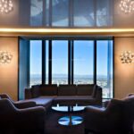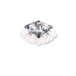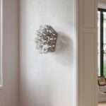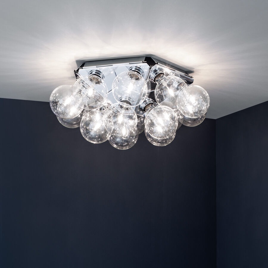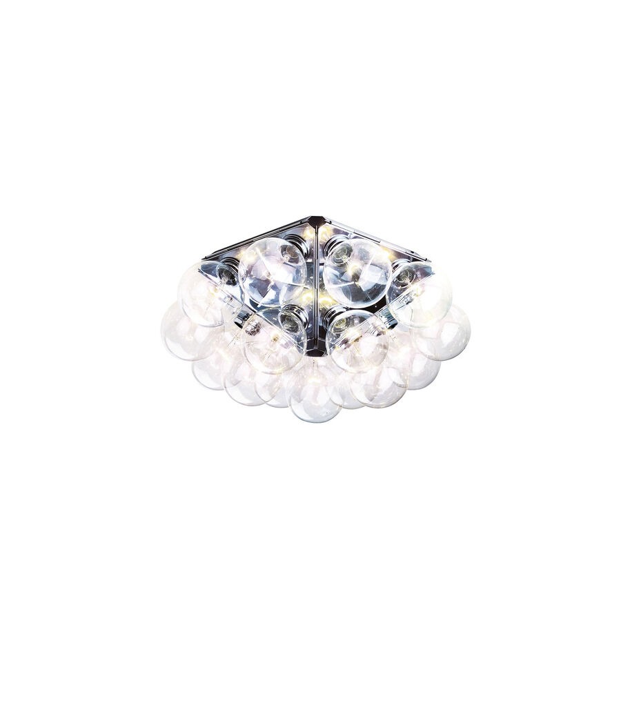 Aplique/plafón de luz directa y refleja. Estructura compuesta por 5 triángulos en aluminio pulido estampado. 15 bombillas Globolux claras se reparten en torno a la estructura. Base de conexión a techo/pared y florón en acero.