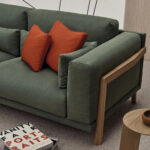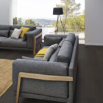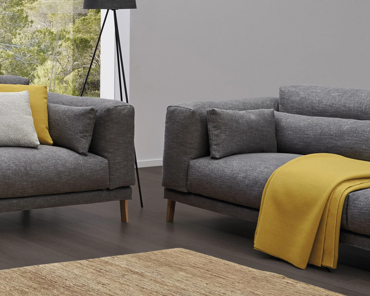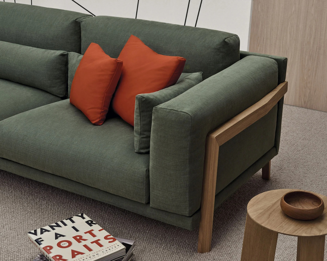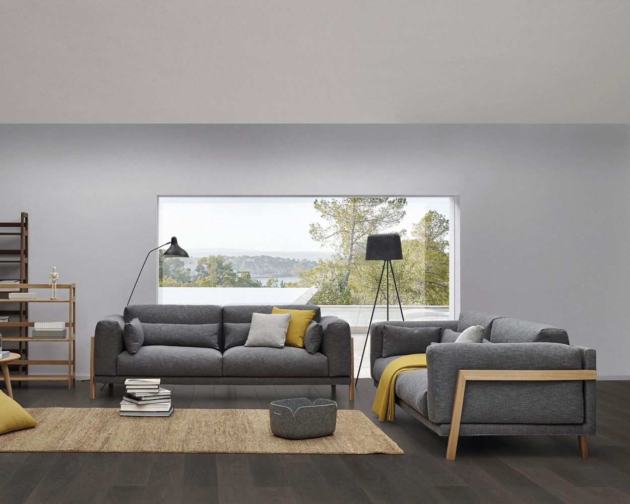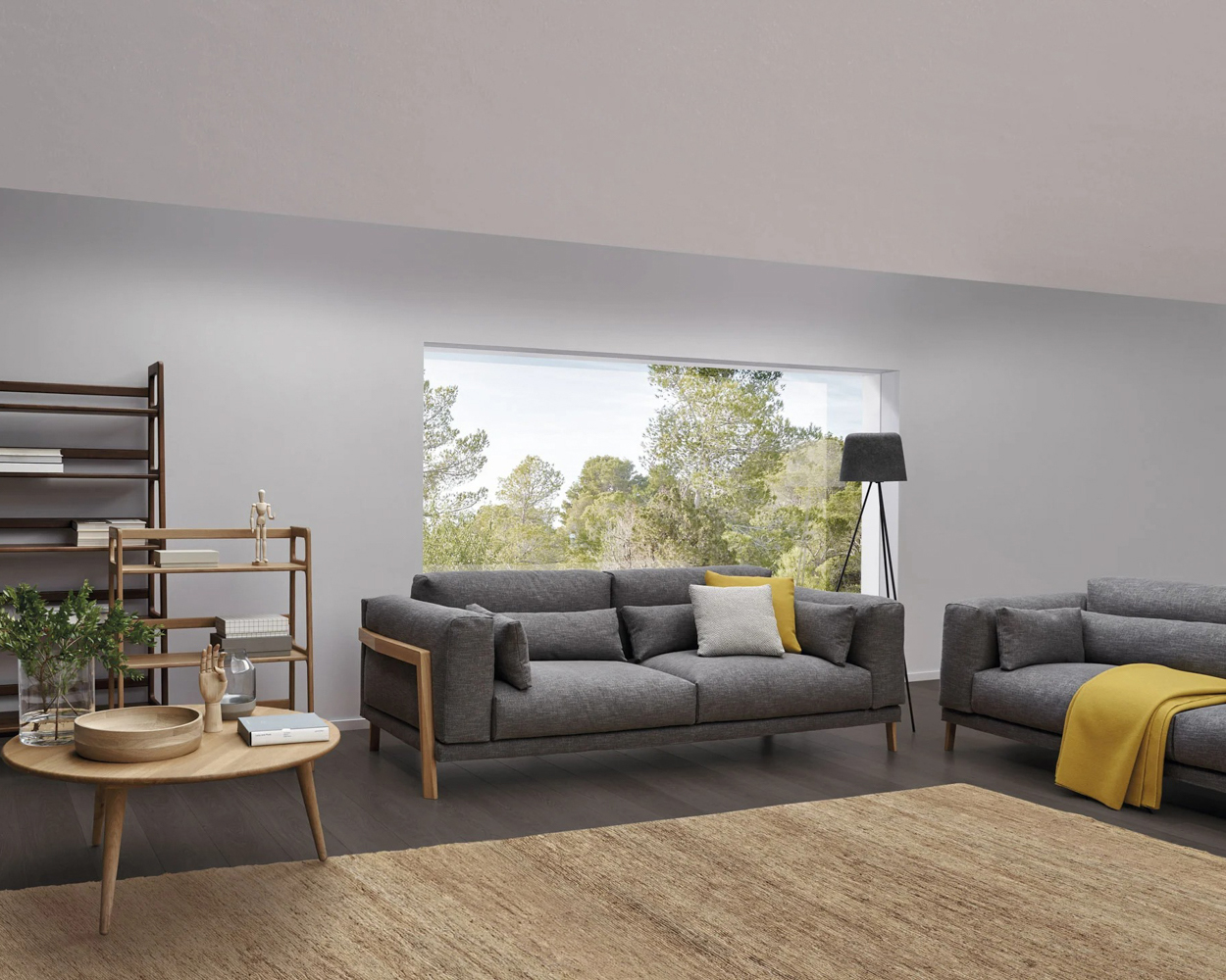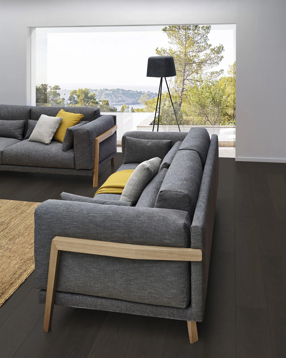 Esencia de comodidad con líneas limpias y un distintivo apoyabrazos de roble que enmarca el conjunto. Cojines voluminosos convierten Time en un refugio de bienestar. Funciona igual de bien en formatos sofá y sistema modular. Diseño de Mario Ruiz.