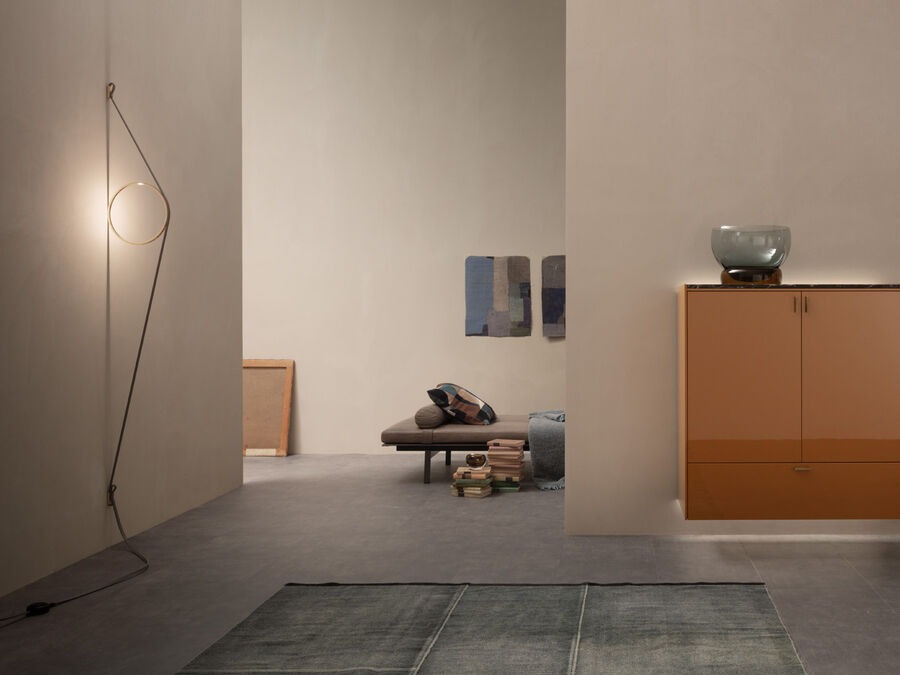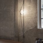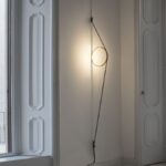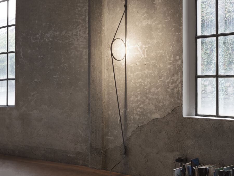 Lámpara de pared de luz indirecta compuesto por un cuerpo de aluminio extruido calandrado con acabado mediante proceso galvánico o pintura. El cable tangente especial, de goma coloreada, garantiza la alimentación eléctrica. El cable se fija en la pared con las juntas de ABS en el mismo acabado del anillo. Función de regulación de la intensidad mediante un interruptor de pedal en el cable. Suministro eléctrico de clavija con enchufes intercambiables. La longitud útil del cable es de 2,5 metros.