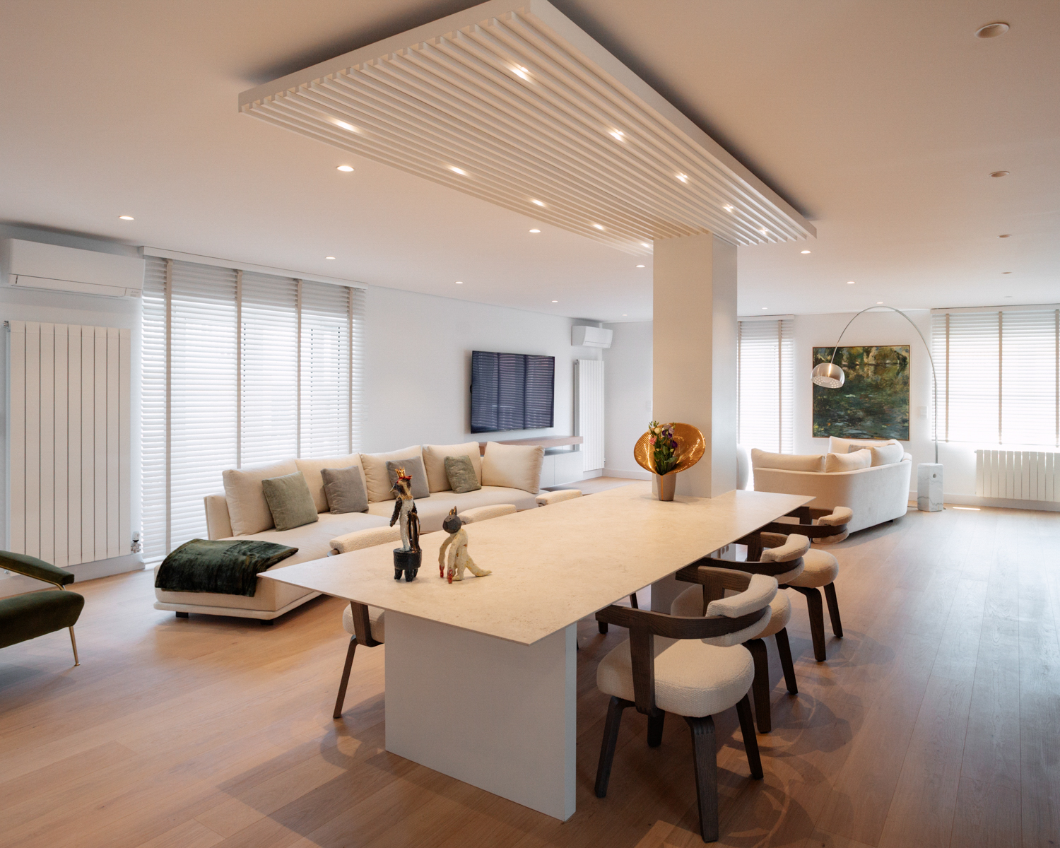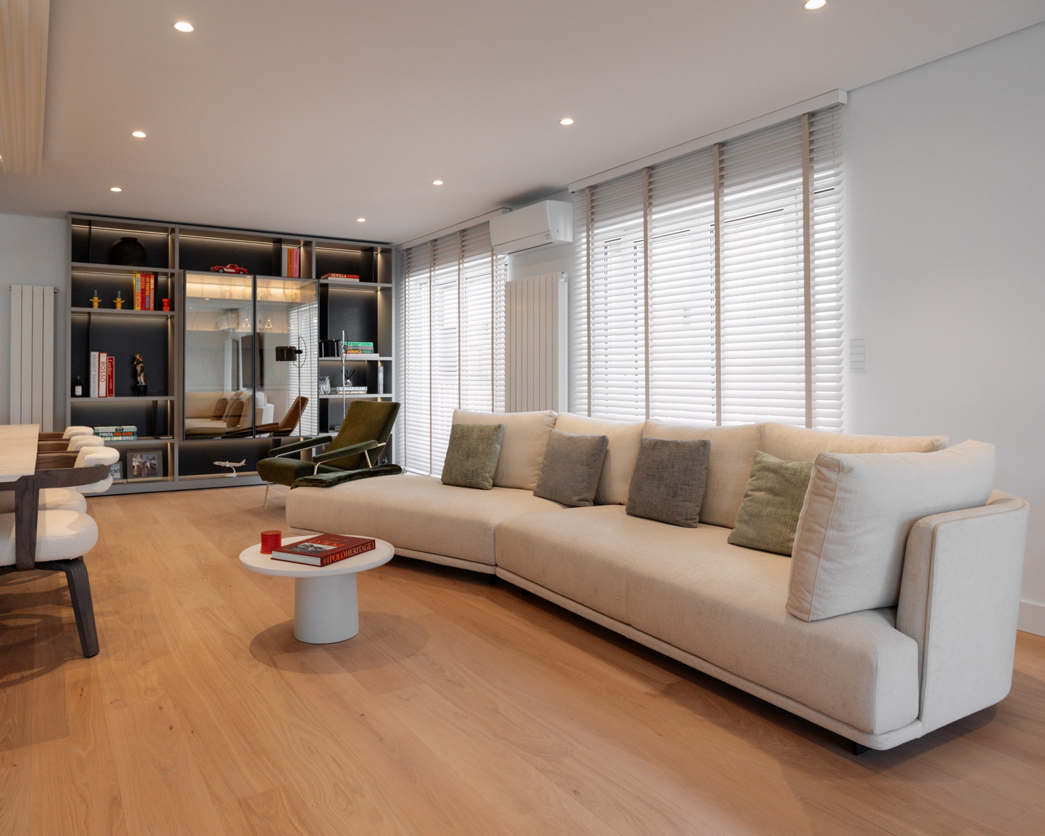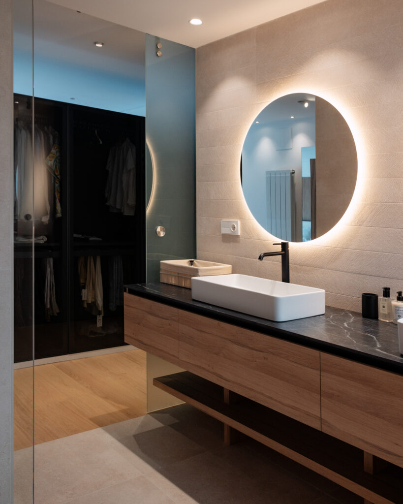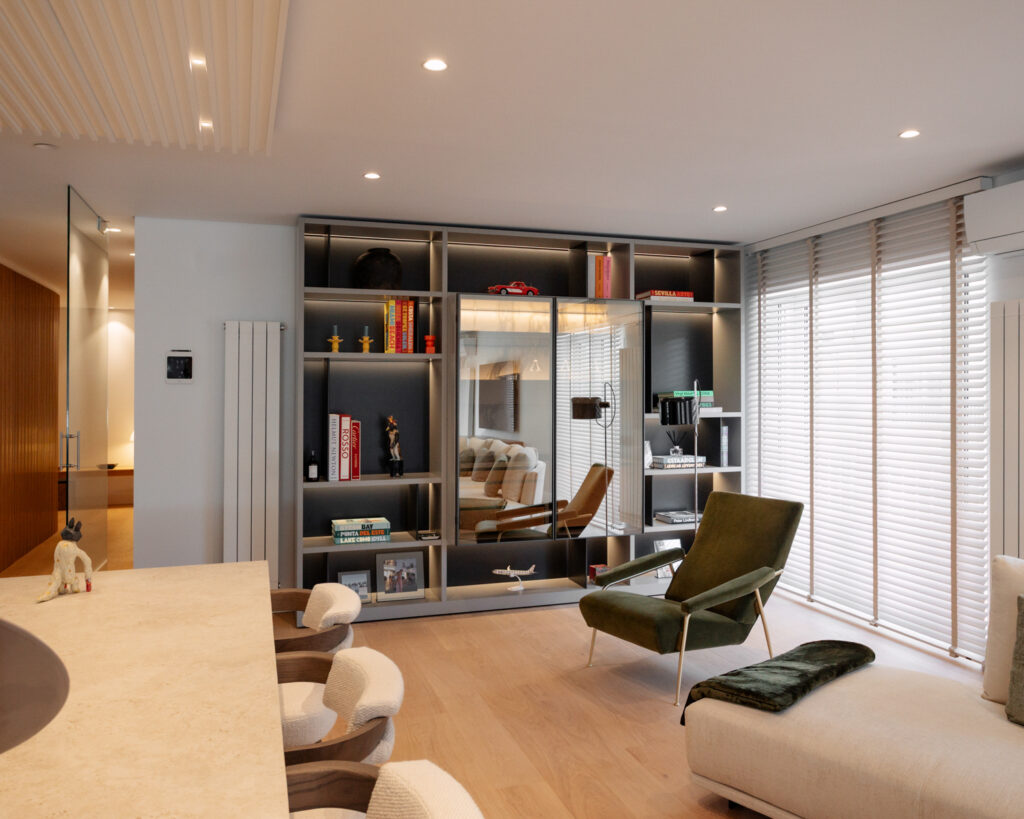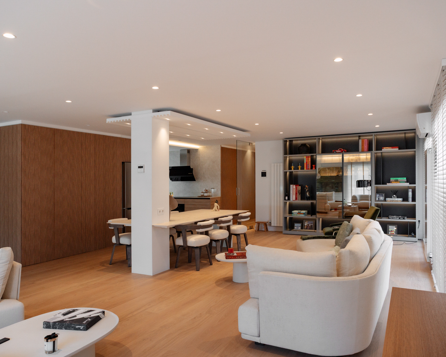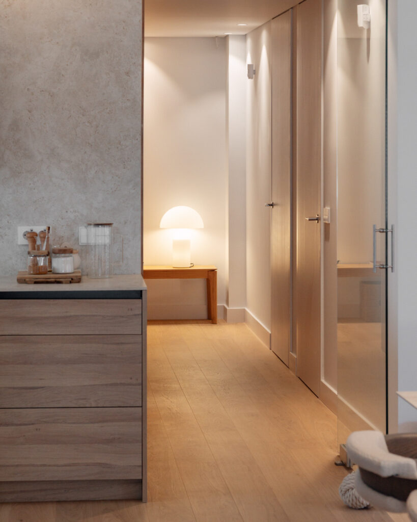 Un hogar pensado para vivirlo. Cada estancia se integra en un conjunto continuo: materiales nobles, texturas agradables al tacto y una gama de colores equilibrada que permite que la luz recorra el espacio con naturalidad. La iluminación, planificada en distintos niveles (general, ambiente y acento), junto con el almacenamiento a medida, mantiene el orden y refuerza la calidez del conjunto.